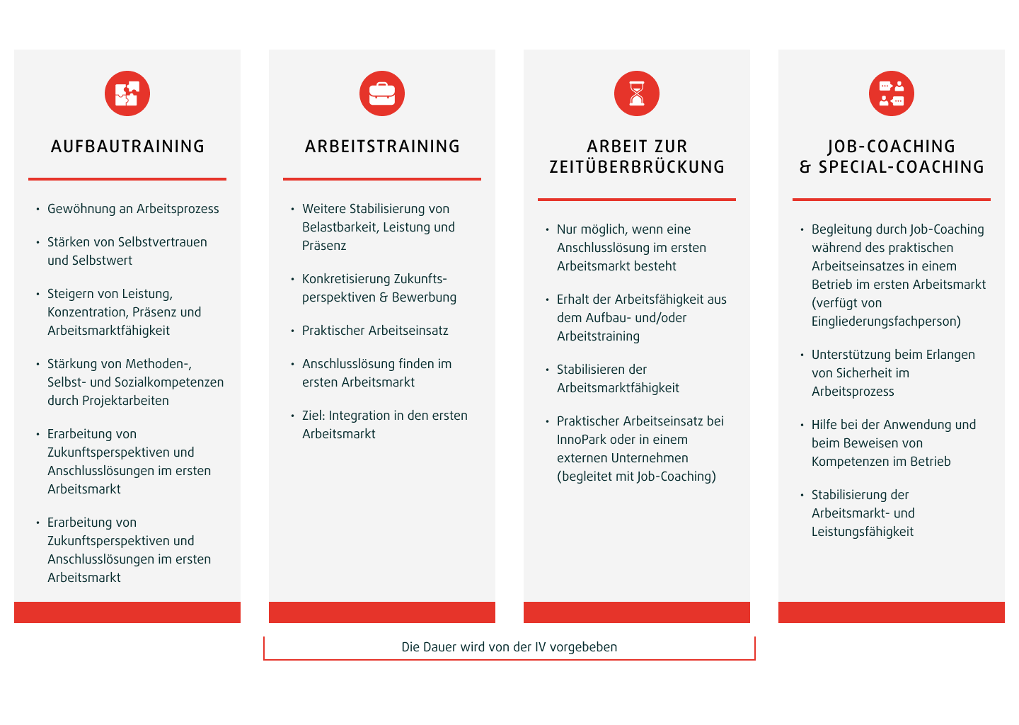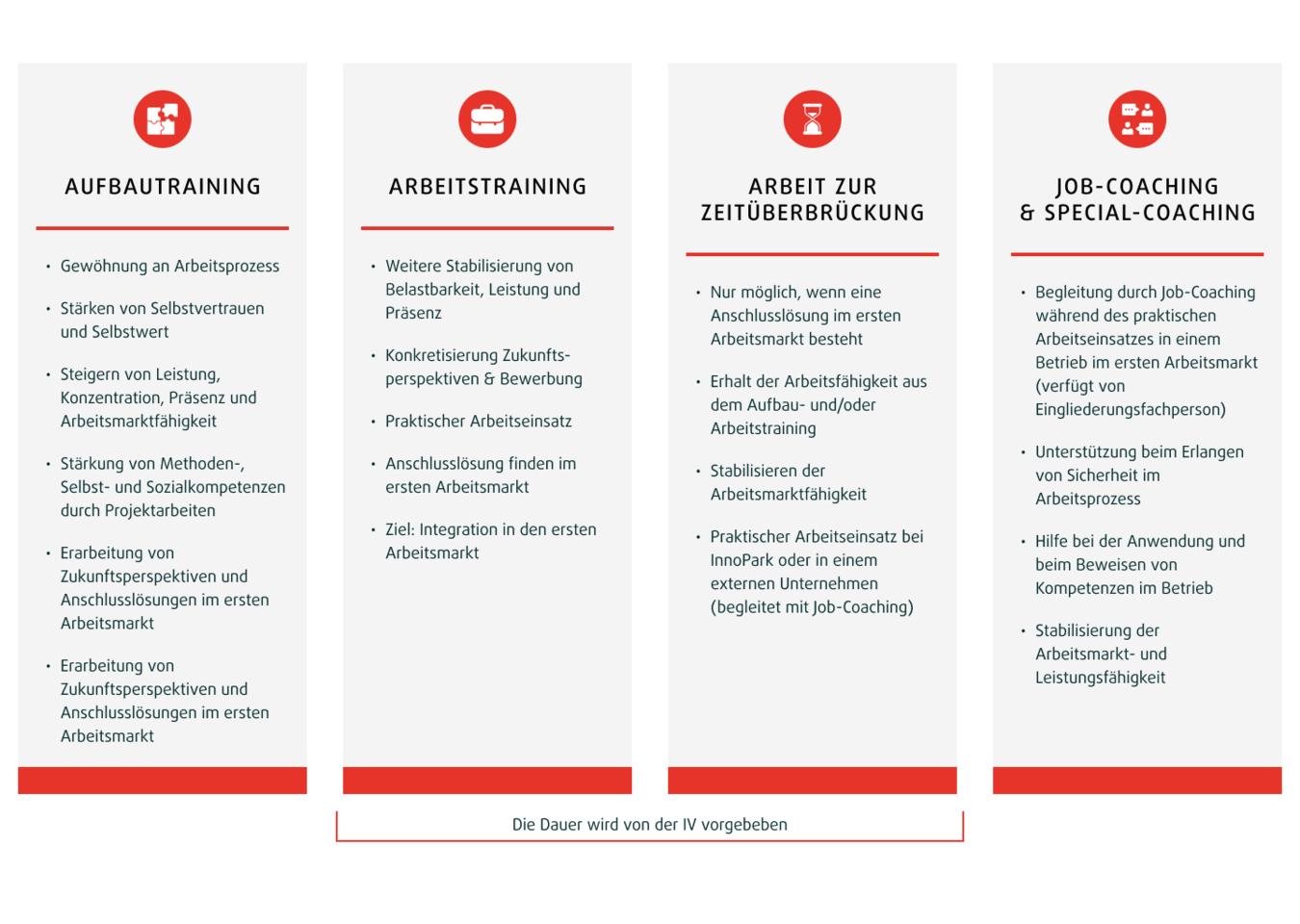 Die Ziele werden von der IV vorgegeben, sind messbar und werden mit einer wirkungsvollen Kombination aus persönlichem Coaching, Bewerbungs- und Projektarbeit erreicht. Der Integrationsprozess wird durch unsere gründliche Vorbereitung Ihres Wiedereintritts in den Arbeitsmarkt effektiv gefördert. Unsere Massnahmen zur Wiedereingliederung richten sich an alle Fachkräfte und Kader aus der Invalidenversicherung.