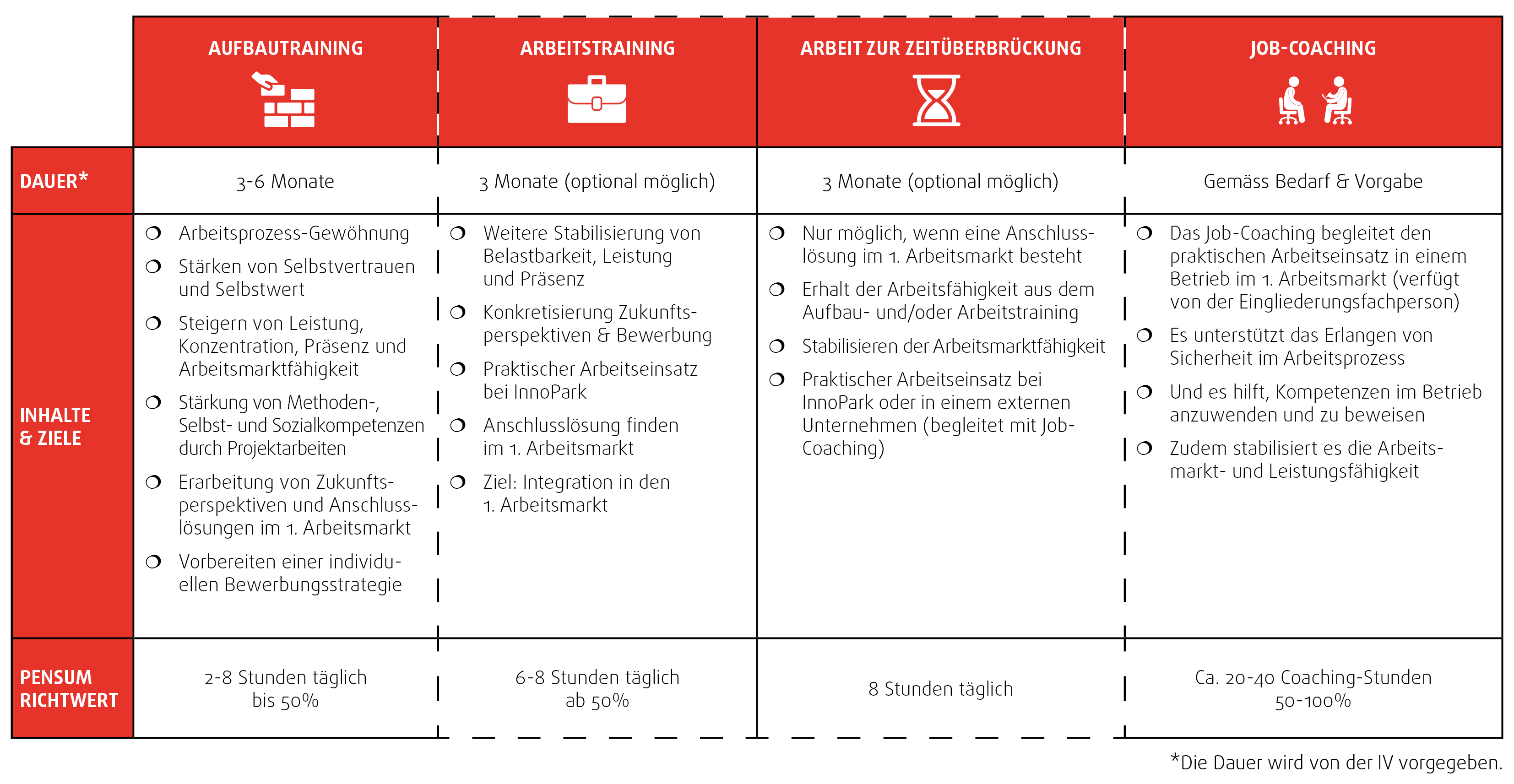 Die Zuweisung zum IV Programm erfolgt durch Ihre Eingliederungsfachperson. Anschliessend findet eine Evaluation im Gespräch mit Ihnen und Ihrer Eingliederungsfachperson statt, worin Ihre individuellen Ziele vereinbart werden. Die Ziele werden von der IV vorgegeben, sind messbar und dienen Ihrer schrittweisen Stärkung und Stabilisierung im Arbeitsintegrationsprozess.