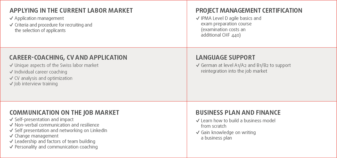 Our program enables you to make profitable use of your period of unemployment and to acquire additional skills alongside your job search. The focus is on project management as well as job application and communication training. All courses and coaching sessions are held in English and participants learn about the Swiss job market and its specifics in detail. Our success speaks for itself: hundreds of job-seeking participants have already completed the program and found a new job.