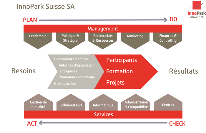 La gestion de la qualité à InnoPark Suisse SA comprend les principaux processus, méthodes et compétences. Elle sert à présenter les différents modules (conformément au guide des processus) aux parties prenantes internes et externes, telles que les clients, les participants, les partenaires et les institutions publiques et privées.